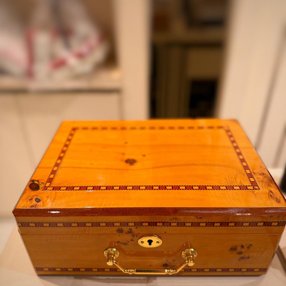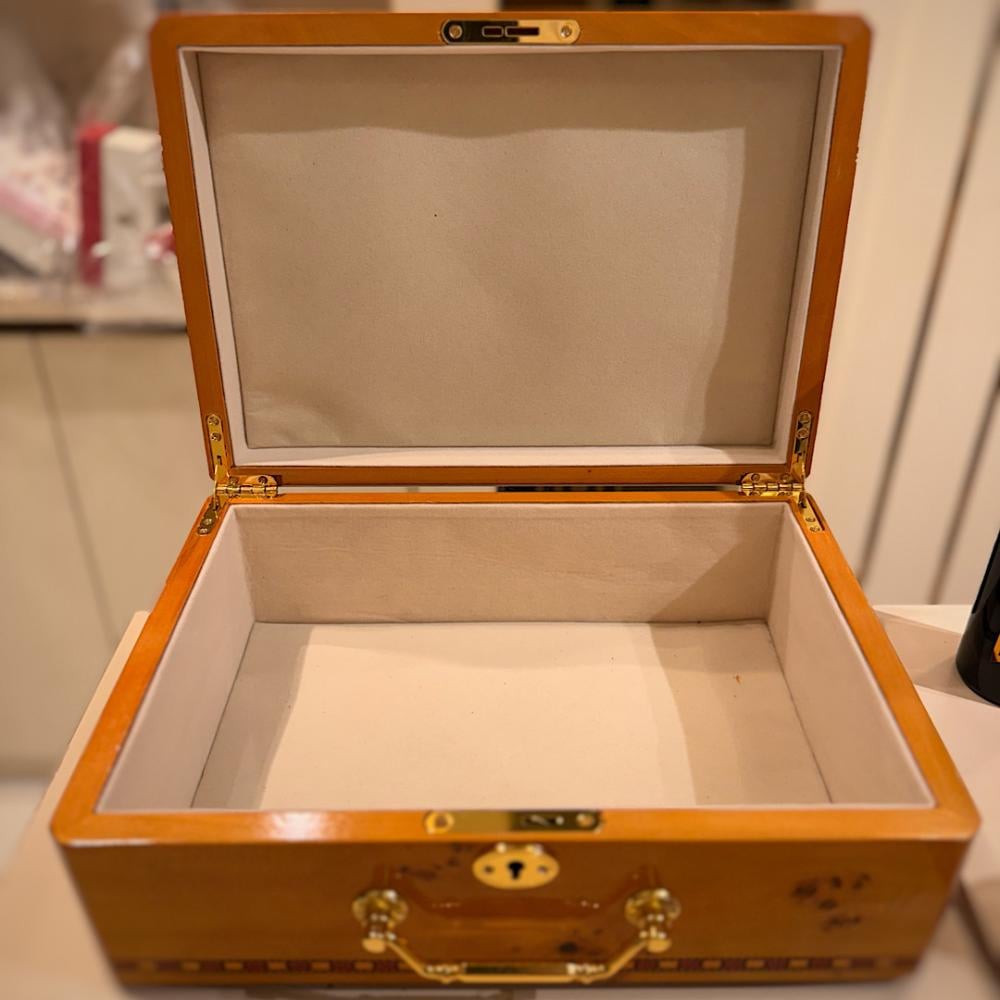 صندوق فاخر خشبي مصنوع من مواد عالية الجودة بتصميم فاخر ومميز وأنيق بألوان وتطريز ابيض يعطي فخامة فالتقديم